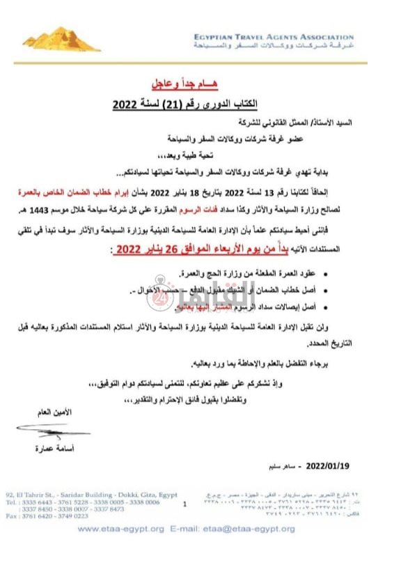 وحصل القاهرة 24 على نسخة من الخطاب المُقدم من الأمين العام لغرفة شركات السياحة، ووكالات السفر لأصحاب الشركات.