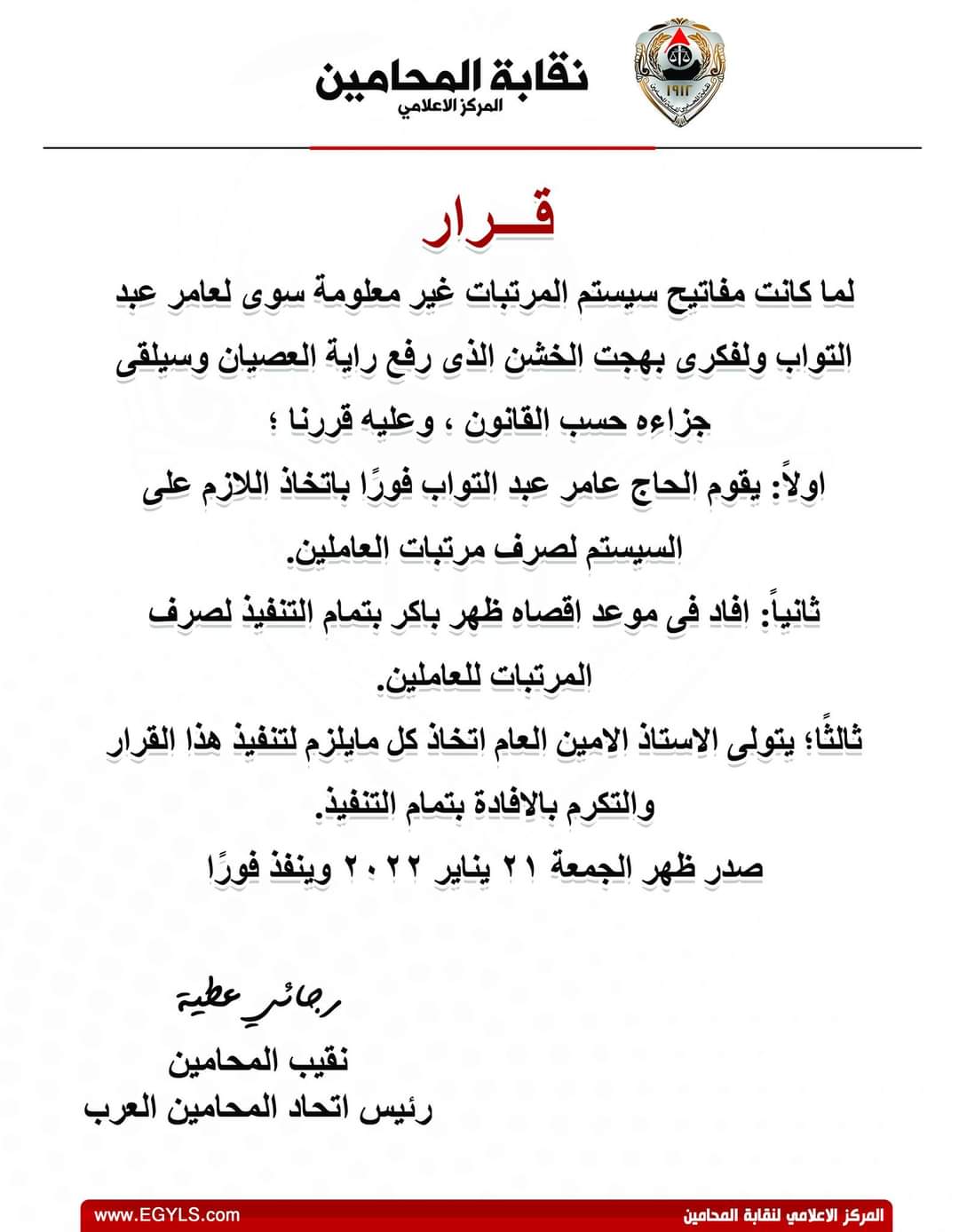 لما كانت مفاتيح سيستم المرتبات غير معلومة سوى لعامر عبد التواب ولفكري بهجت الخشن، الذي رفع راية العصيان وسيلقى جزاءه حسب القانون، وشمل القرار يقوم الحاج عامر عبد التواب فورًا باتخاذ اللازم على السيستم لصرف مرتبات العاملين.