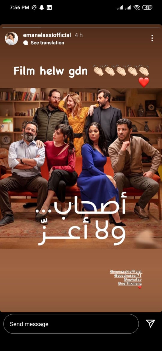 وكتبت إيمان العاصي، على حسابها الشخصي بموقع إنستجرام، قائلة: فيلم حلو جدًا.