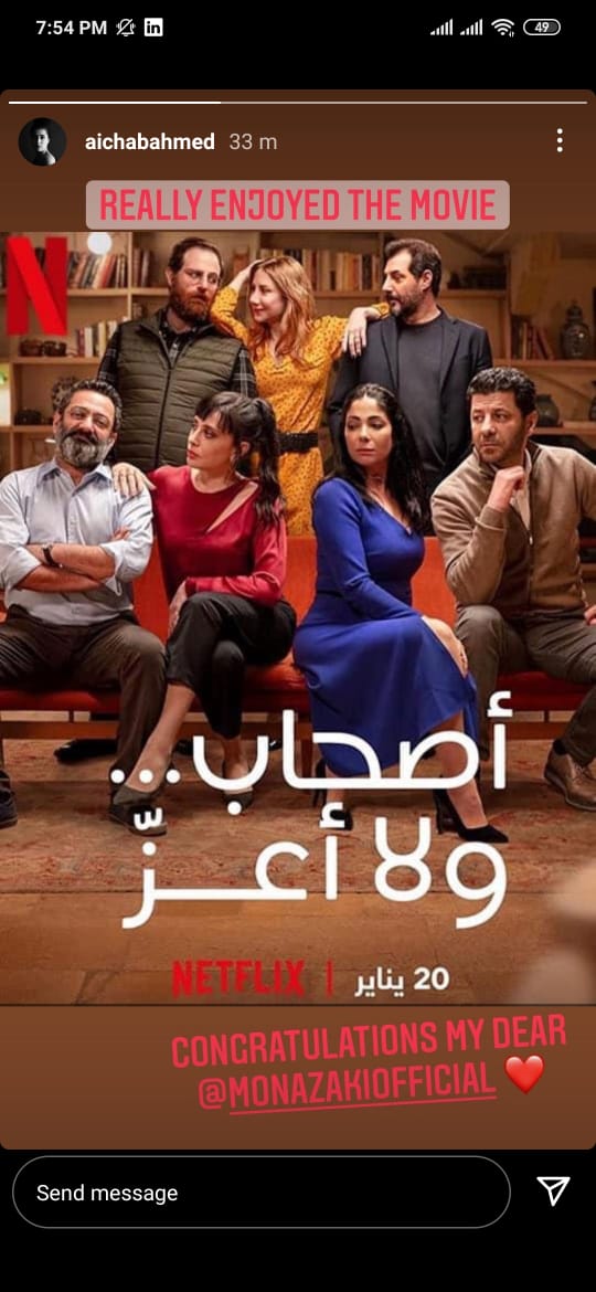 بينما نشرت عائشة بن أحمد عبر ستوري على حسابها الشخصى انستجرام، صورة لأبطال الفيلم وكتبت: مبروك عزيزتى منى زكي فعلا استمتعت بالفيلم.