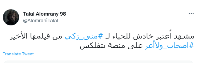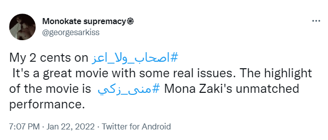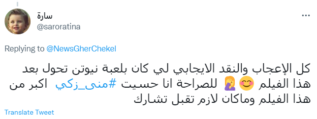 وقال حساب عبر تويتر: فيلم به بعض المشاكل، لكن أداء منى زكي لا مثيل له.