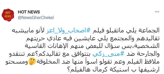 وكتب حساب آخر: الجماعة يلي ماتقبلو فيلم اصحاب ولااعز لأنو مابيشبه تقاليدهم والمجتمع يلي عايشين فيه عادي حريتهم الشخصية،بس سؤال للبعض منهم الإهانات القاسية والجارحة ضد منى زكي بتتوافق مع تقاليدكم؟عم تنتقدو ملافظ الفيلم وعم تقولو اسوأ منها ضد المخلوقة، ومسحتو ارشيفها ب استيكة كرمال هالفيلم؟، فيما علق آخر: مشهد أُعتبر خادش للحياء لمنى زكي من فيلمها الأخير اصحاب ولاأعز على منصة نتفلكس.