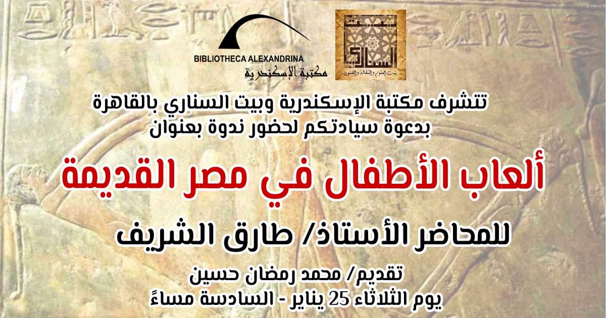 تنظم مكتبة الإسكندرية؛ ندوة مجانية مفتوحة للجمهور، تحت عنوان ألعاب الأطفال في مصر القديمة، وذلك يوم الثلاثاء الموافق 25 من الشهر الجاري، في تمام السادسة مسًاء، بمقر بيت السناري الأثري بالسيدة زينب، التابع لمكتبة الإسكندرية.