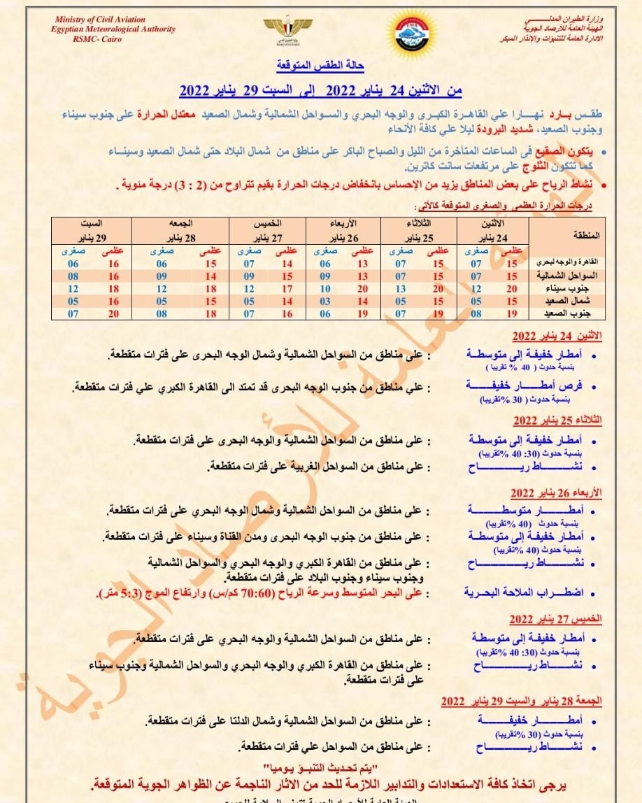 ونشرت الهيئة العامة للأرصاد الجوية، في بيان لها حالة الطقس المتوقعة خلال الفترة من الاثنين 24 يناير إلى السبت 29 يناير كالتالي: