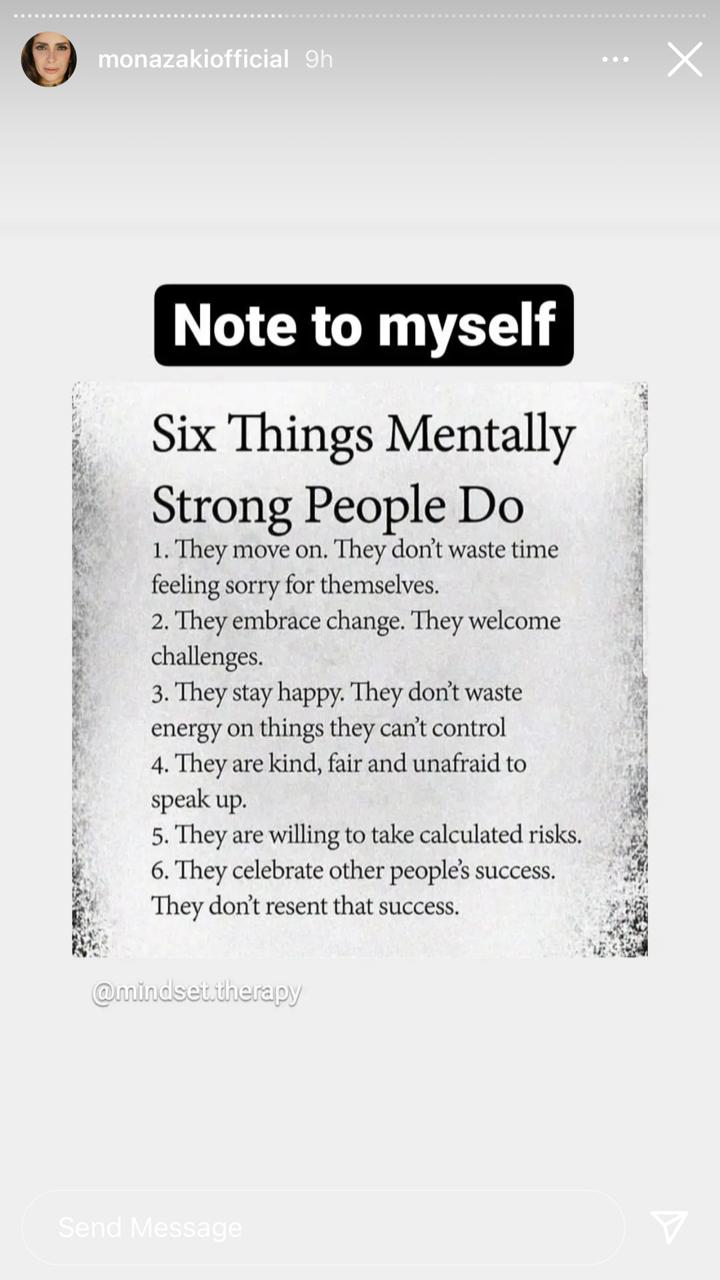 ونشرت منى زكي صورة ضمت العديد من النصائح للأشخاص الأقوياء، عبر خاصية استوري على موقع تبادل الصور والفيديوهات انستجرام، وعلقت منى زكي: هذه النصائح أوجهها إلى نفسي، وكانت النصائح هي تخطي كل الصعاب، ولا تضيعي وقتك في الحزن على نفسك، اعرفي قيمة التغيير ورحبي بكل التحديات في حياتك، كوني سعيدة ولا تهدري طاقتك في محاولة تغيير شيء ليس بإمكانك تغييره، كوني لطيفة وطيبة ولا تخافي من التعبير عن نفسك وآرائك، خذي المغامرات والتحديات ولكن احسبي كل شيء أولا، احتفلي بنجاح كل من حولك.