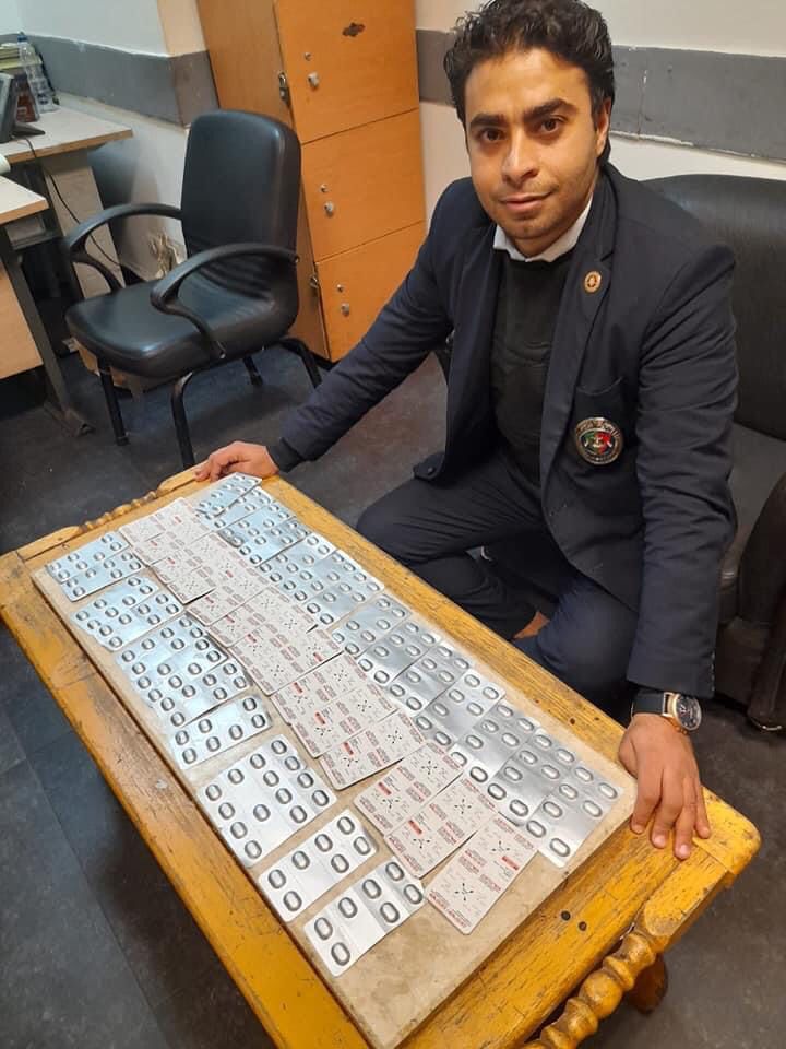 وتم تمرير حقائبه على جهاز الفحص بالأشعة X-RAY بمعرفة أحمد بحيري، مأمور الجمرك المعين على جهاز الفحص، بالأشعة أفاد بوجود شرائط أدوية.
