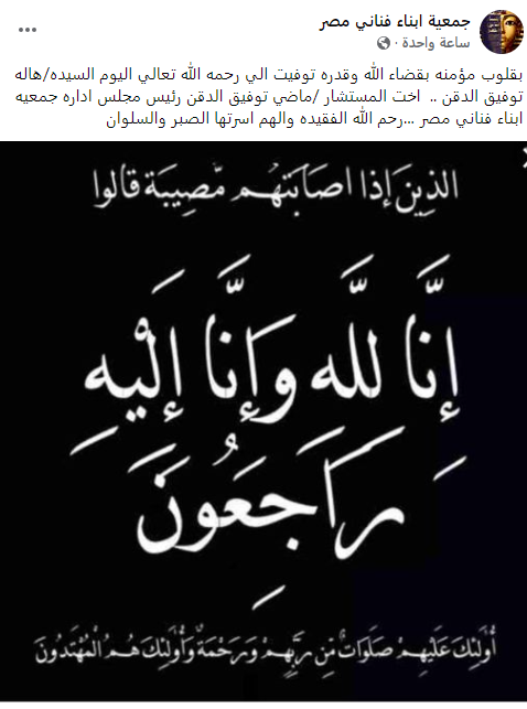 رحلت عن عالمنا هالة الدقن، ابنة الفنان الراحل توفيق الدقن، وشقيقة المستشار ماضي توفيق الدقن.