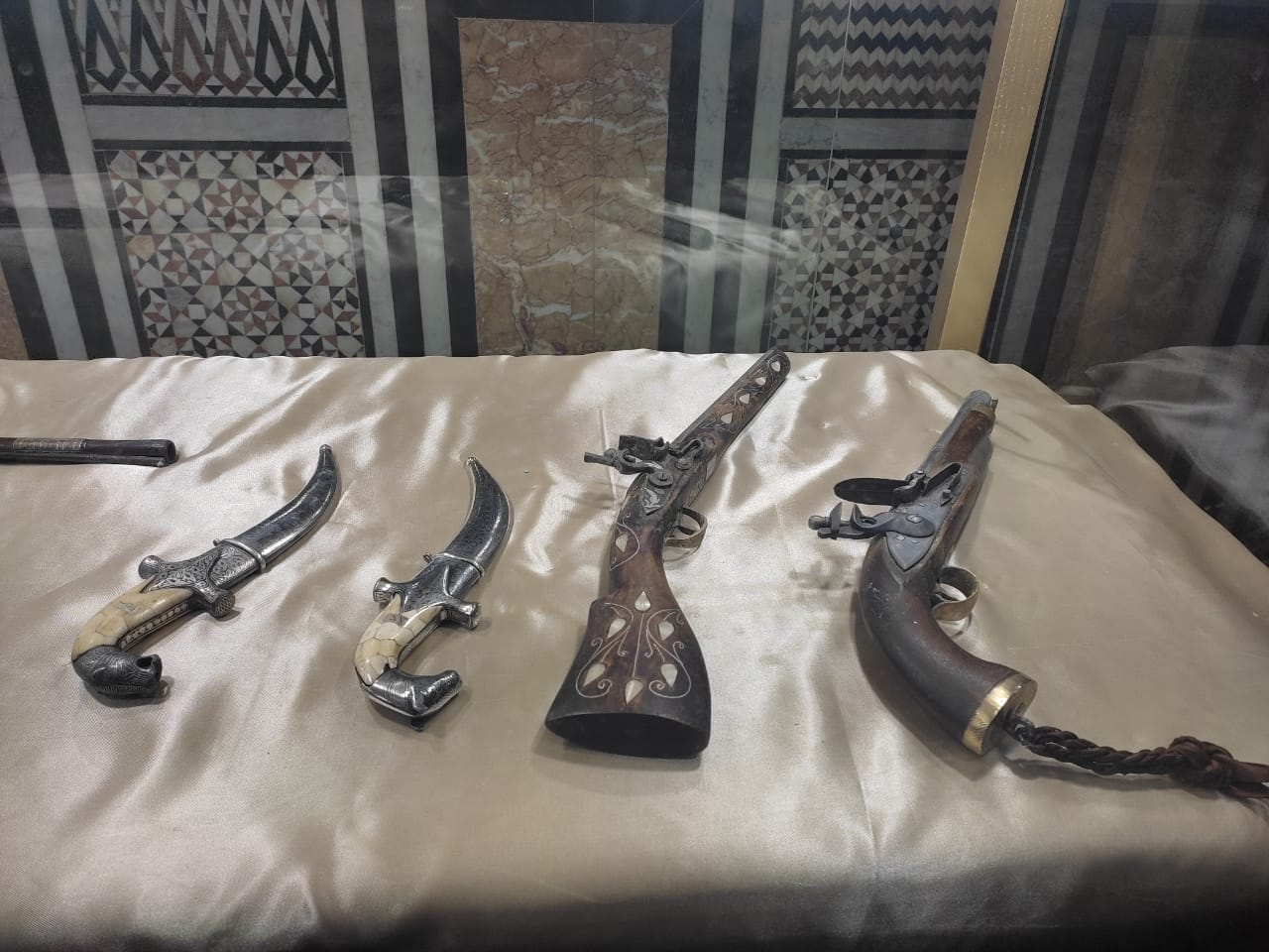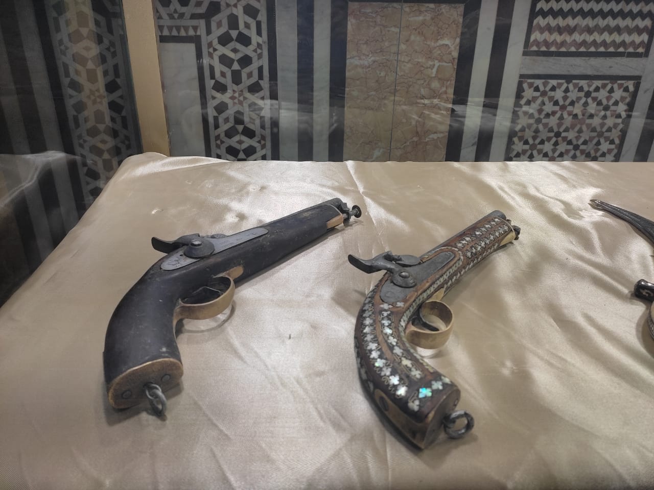 يعرض ثلاثة قطع عبارة عن طبنجة مكفته بالذهب، من مقتنيات أسرة محمد علي، ذات مقبض من الخشب عليها زخارف نباتية متشابكة وفي نهاية المقبض جامه بداخلها رأس أسد بارز، والماسورة مصنوعة من الصلب عليها زخارف نباتية يتخللها بحور كتابية بالخط الفارسي.