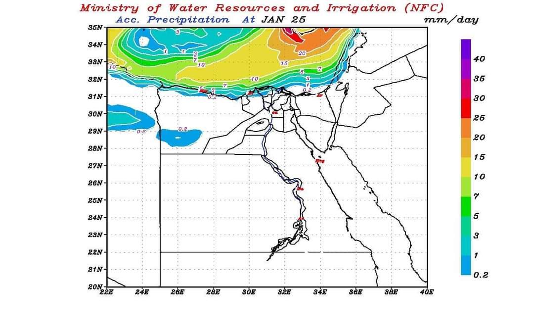وأضاف المركز، أنه يوم الأربعاء الموافق 26 يناير 2022، تتعرض مناطق من السواحل الشمالية لسقوط أمطار غزيرة تصل إلى 25 مم وتتعرض مناطق من محافظات الوجه البحري، وسيناء لسقوط أمطار خفيفة إلى متوسطة تتراوح من 1-10 مم، وقد تصل إلى أجزاء من القاهرة وشمال الصعيد.