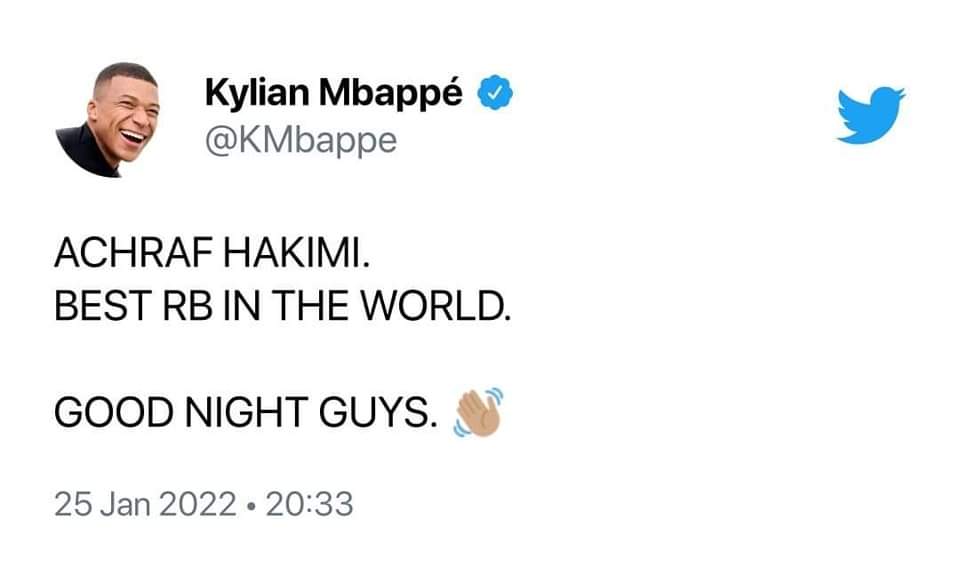 وكتب مبابي عبر حسابه الشخصي على موقع التواصل الاجتماعي تويتر منذ قليل، بعد متابعته لهدف أشرف حكيمي في شباك منتخب مالاوي من تسديدة مميزة: حكيمي أفضل ظهير أيمن في العالم.