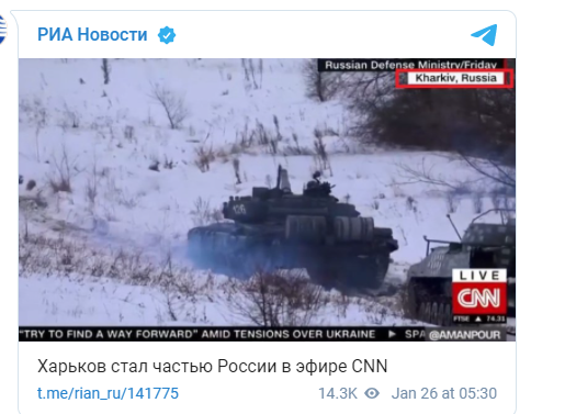وتم خلال التقرير عرض لقطات لمركبات مدرعة تسير في تضاريس شتوية، وتجري تدريبات عسكرية، قالت إنها تابعة للجيش الروسي، حيث وضعت CNN اسم الموقع الجغرافي خاركوف - روسيا، بدلا من خاركوف - أوكرانيا.
