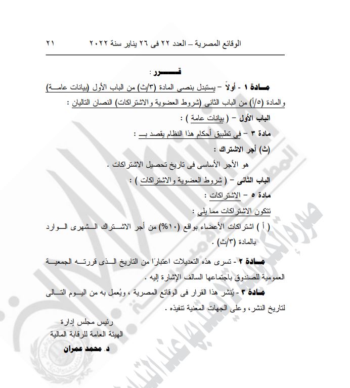 نشرت الجريدة الرسمية قرار الرقابة المالية، اليوم الأربعاء، بعد الاطلاع على قانون صناديق التأمين الخاصة ولائحته التنفيذية رقم 54 لسنة 1975، وعلى مذكرة الإدارة المركزية للإشراف والرقابة على صناديق التأمين الخاصة بالهيئة المؤرخة 23-11-2021.