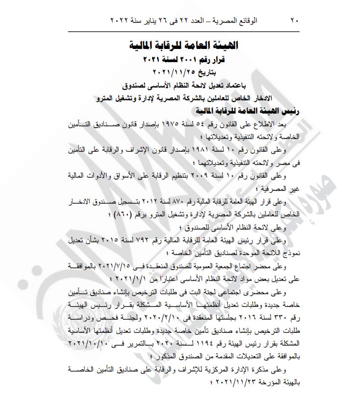 وافقت الهيئة العامة للرقابة المالية، على اعتماد تعديل لائحة النظام الأساسي لصندوق الادخار الخاص للعاملين بالشركة المصرية لإدارة وتشغيل المترو.