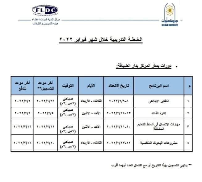 مركز تنمية قدرات أعضاء هيئة التدريس بجامعة حلوان يعلن خطته التدريبية لـ فبراير 2022