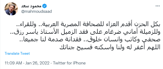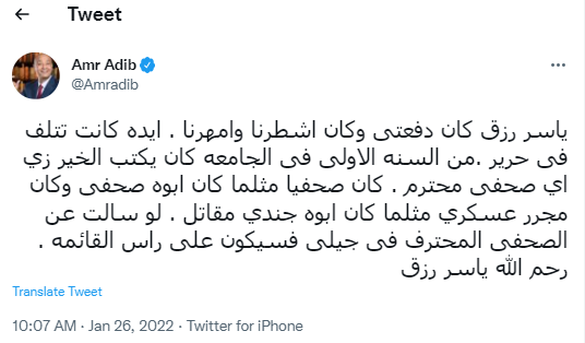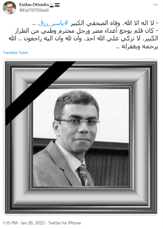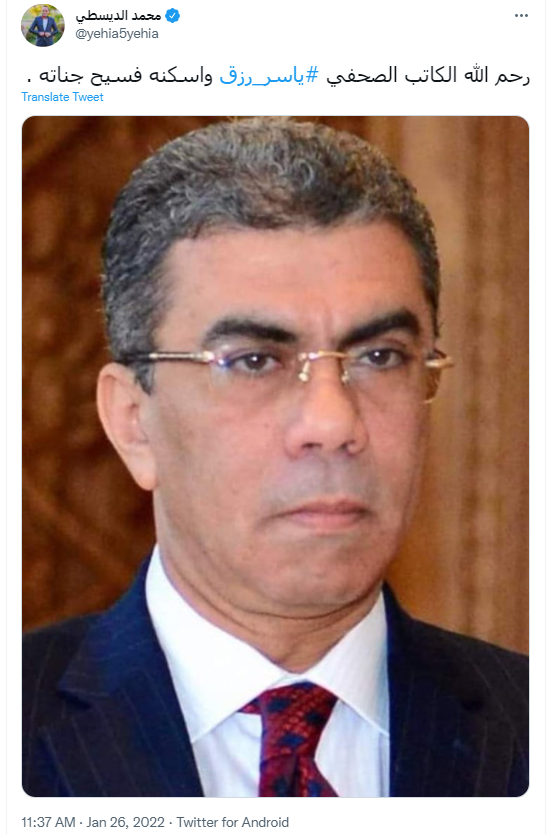 كتب حساب باسم محمد الديسطي عبر تويتر: رحم الله الكاتب الصحفي ياسر رزق وأسكنه فسيح جناته.