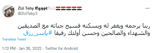 وقال آخر: ربنا يرحمه ويغفر له ويسكنه فسيح جناته مع الصديقين والشهداء والصالحين وحسن أولئك رفيقا.. ياسر رزق.
