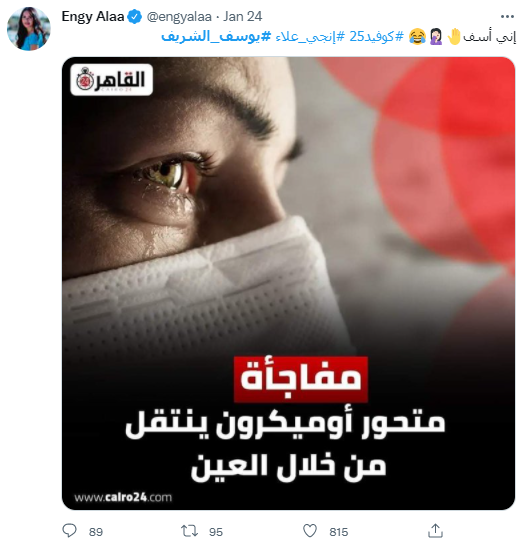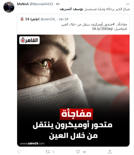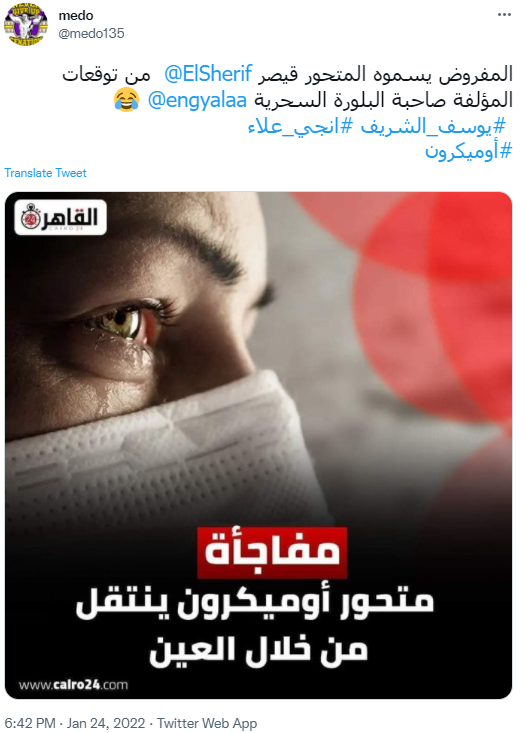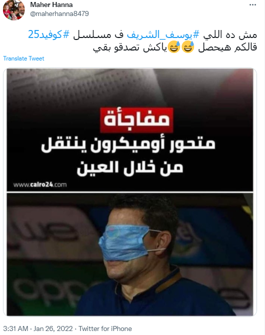 تصدر اسم الفنان يوسف الشريف تريند تويتر، نتيجة خبر نشره موقع القاهرة 24؛ يتضمن انتقال متحور أوميكرون الجديد لفيروس كورونا المستجد عبر العين، الأمر الذي ربطه المتابعين بمسلسله كوفيد 25؛ الذي عُرض في السباق الرمضاني لعام 2021، وكانت قصته تدور حول فيروس قاتل تنتشر العدوى به عن طريق العين.