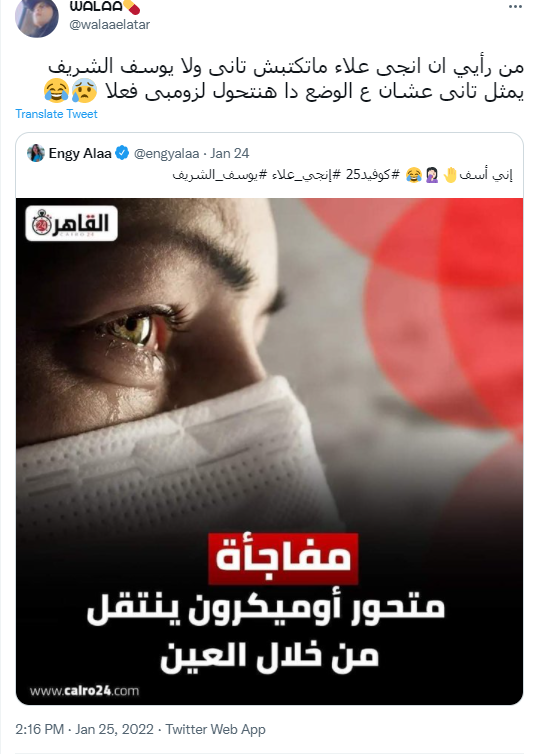 ونشر حساب آخر الخبر، معلقًا: من رأيي إن إنجي علاء ماتكتبش تاني، ولا يوسف الشريف يمثل تاني عشان ع الوضع دا هنتحول لزومبي فعلا.