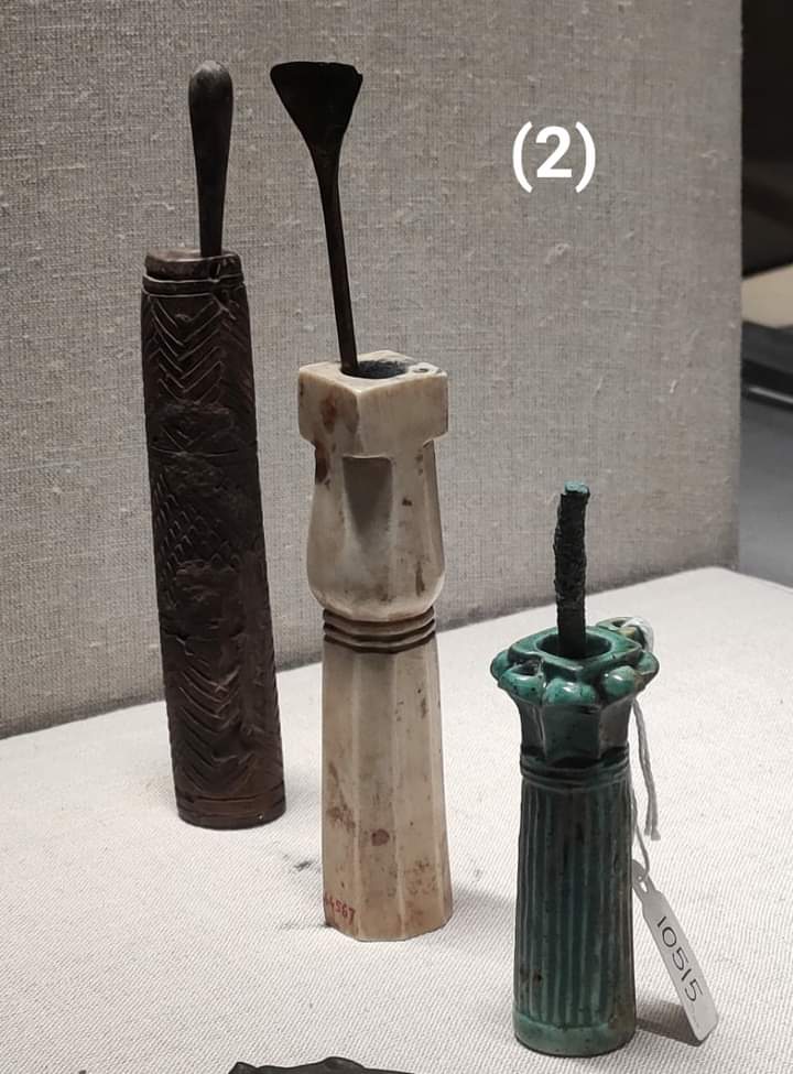 - أوعية الكحل، استخدم المصريون الكحل لتحديد العيون سواء للذكور أو الإناث علي السواء، كما أنه كان يساعد علي حماية العين من حرارة الشمس ومن الهواء ويضفي علي العين حماية روحانية.