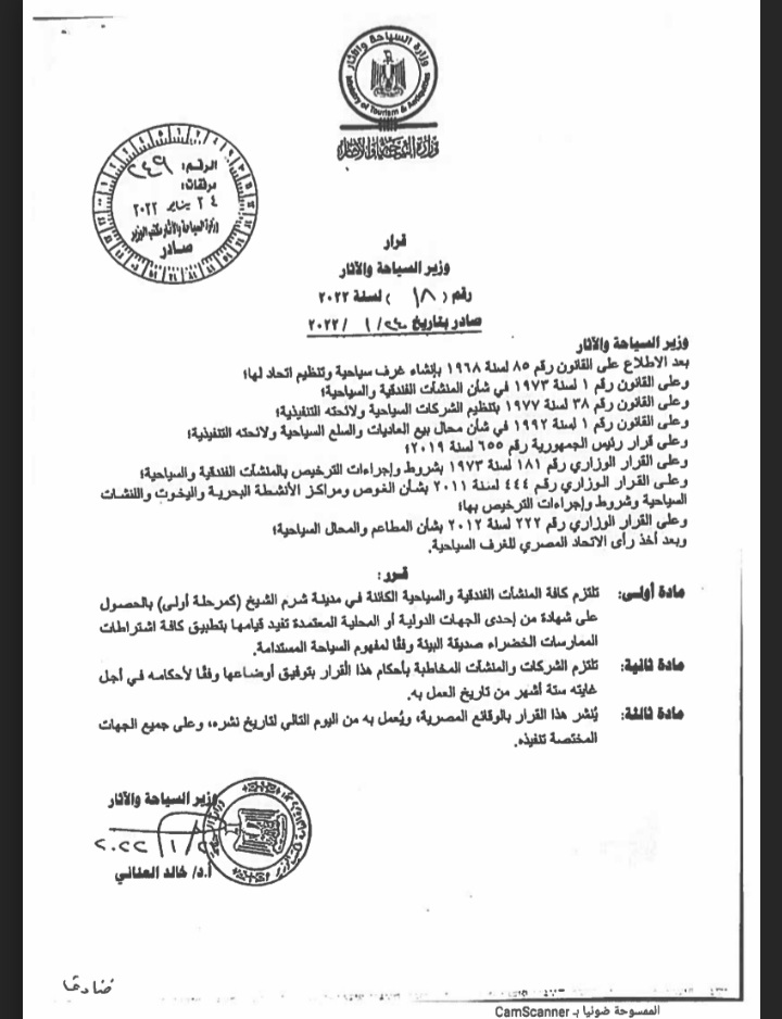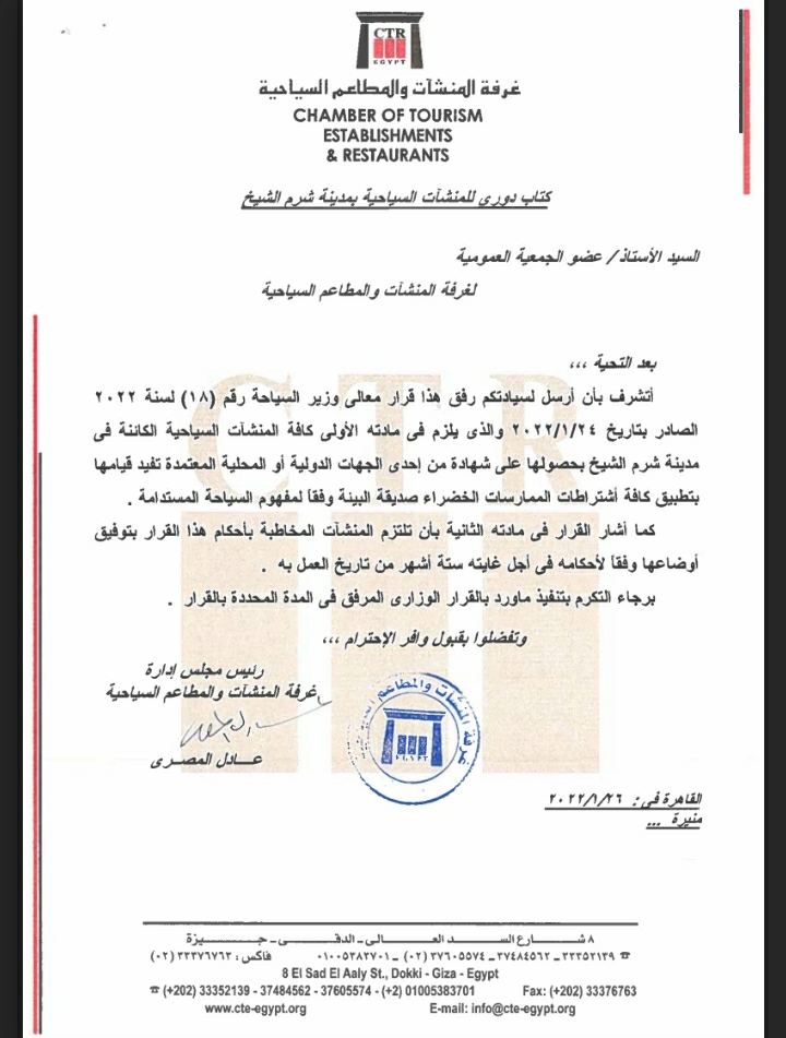 وحصل القاهرة 24 على نسخة من الخطاب الموجه من رئيس غرفة المنشآت والمطاعم السياحية إلى أصحاب المنشآت السياحية، وأيضا على نسخة من قرار وزير السياحة والآثار؛ الذي يلزم فيه بتطبيق كافة اشتراطات الممارسات الخضراء صديقة البيئة للمنشآت السياحية، وفقًا لمفهوم السياحة المستدامة.