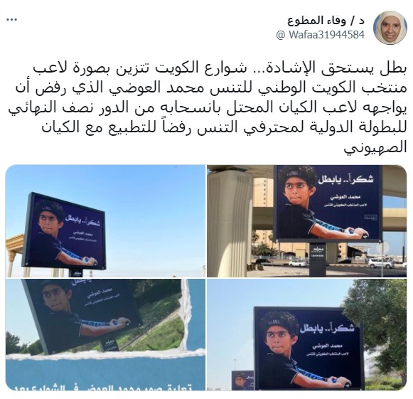الدكتورة وفاء المطوع بجامعة شيفيلد البريطانية، كتبت في تغريدة لها تأييدًا لموقف محمد العوضي، بطل يستحق الإشادة، شوارع الكويت تتزين بصورة لاعب منتخب الكويت الوطني للتنس محمد العوضي الذي رفض أن يواجهه لاعب الكيان المحتل بانسحابه من الدور نصف النهائي للبطولة الدولية لمحترفي التنس رفضًا للتطبيع مع الكيان الصهيوني.