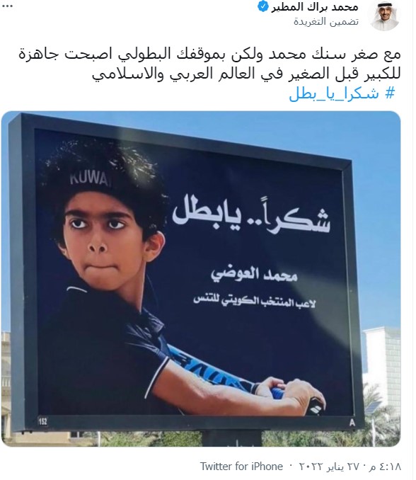 شكرا يا بطل، هكذا حظي اللاعب الكويتي محمد العوضي، لاعب منتخب بلاده للتنس، بإشادات عربية على مواقع التواصل الاجتماعي، تعليقًا على انسحابه من مواجهة اللاعب الإسرائيلي في بطولة دبي، دعمًا للقضية الفلسطينية.