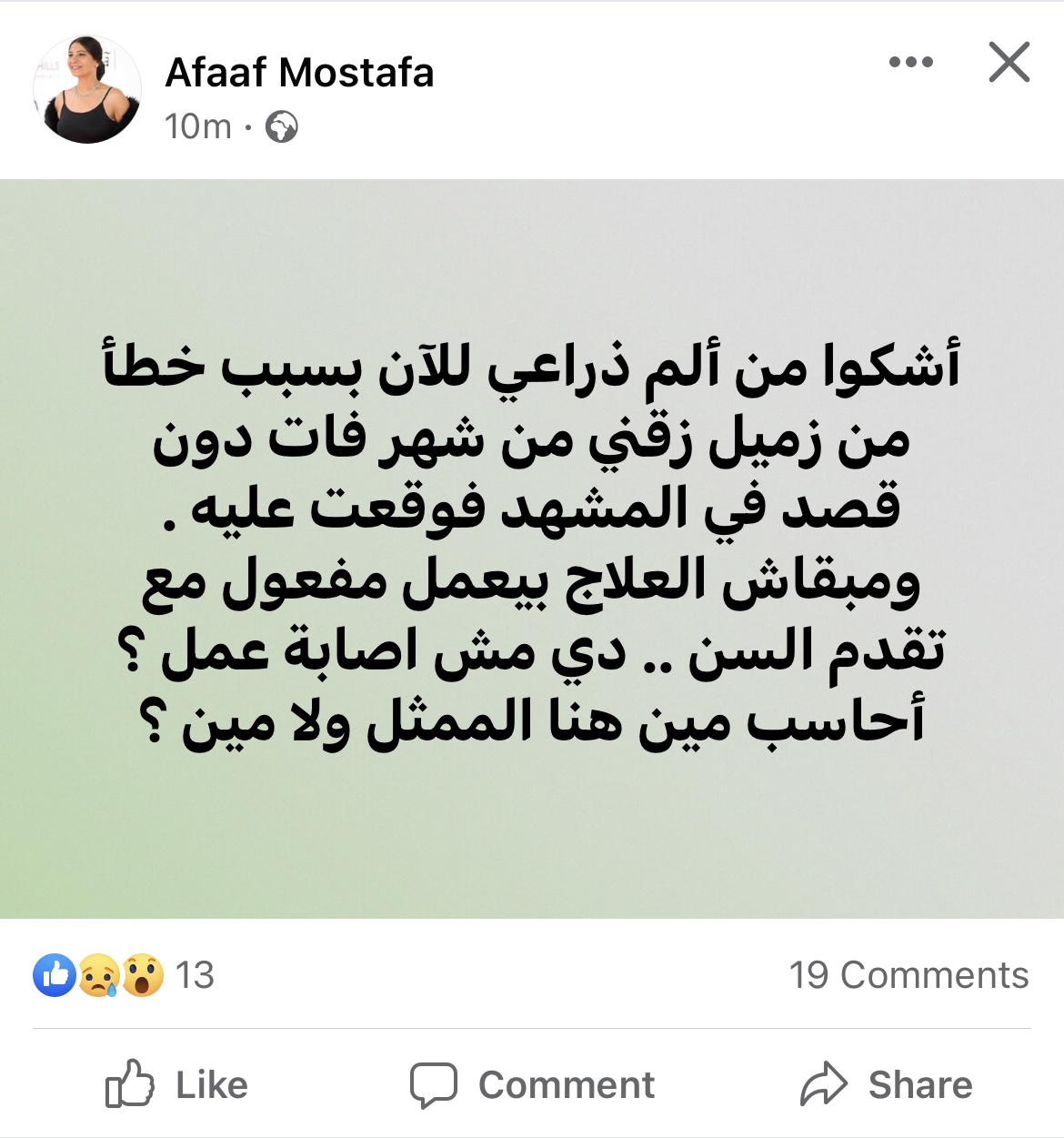 وكتبت عفاف مصطفى على حسابها الشخصي بموقع التواصل الاجتماعي فيسبوك: أشكوا من ألم ذراعي للآن بسبب خطأ من زميل زقني من شهر فات دون قصد في المشهد فوقعت عليه.. ومبقاش العلاج بيعمل مفعول مع تقدم السن.. دي مش إصابة عمل؟ أحاسب مين هنا الممثل ولا مين؟