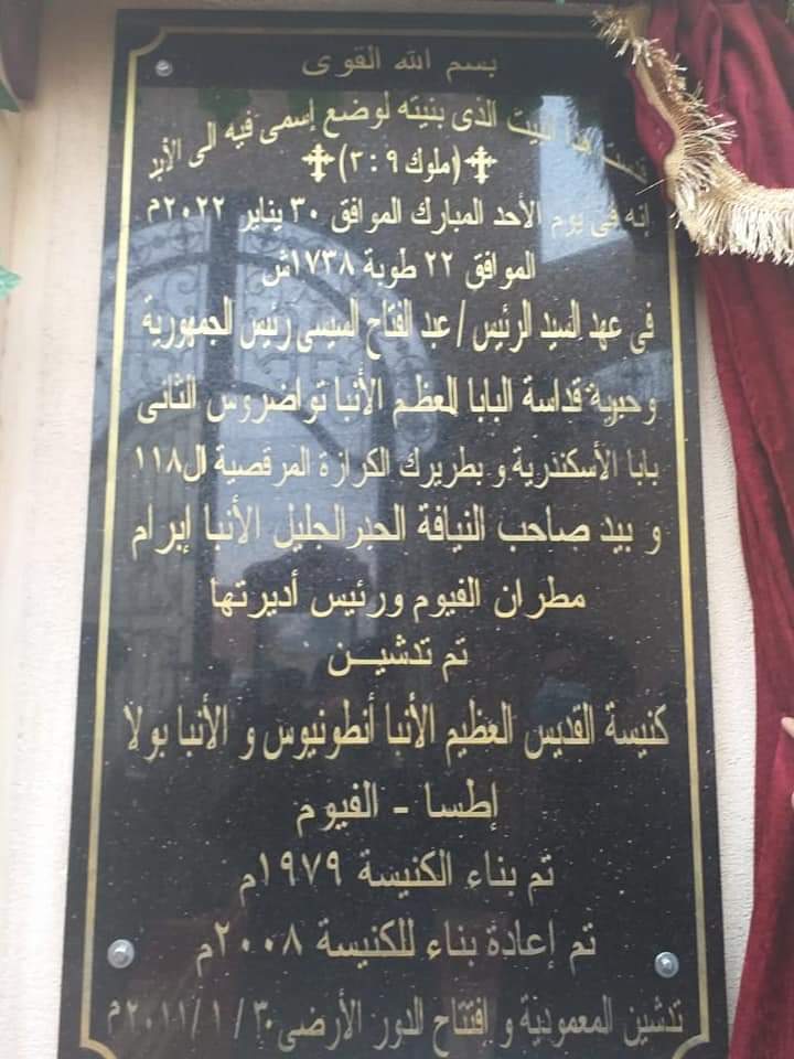 دشّن نيافة الأنبا أبرام، مطران ورئيس أديرة الفيوم مذبحين وأيقونات كنيسة الأنبا أنطونيوس والأنبا بولا بمركز إطسا بإيبارشية الفيوم، بعد إعادة بنائها، بمشاركة نيافة الأنبا صليب أسقف ميت غمر ودقادوس، وذلك في تذكار نياحة القديس الأنبا أنطونيوس أب الرهبان.