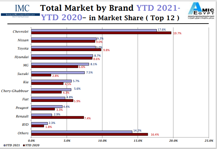 ووفقًا لـ أميك تربعت علامة هيونداي الكورية على قمة مبيعات السيارات الملاكي في السوق المحلي متفوقة بذلك على بقية العلامات، حيث استحوذت على نسبة 11،6 من إجمالي المبيعات.