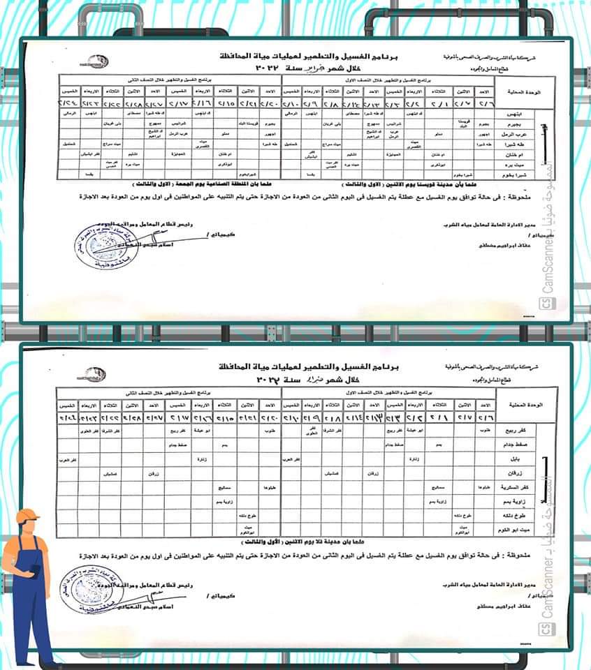 أعلن محمد نجيب صالح، رئيس شركة المياه بالمنوفية، عن خطة غسل شبكات المياه بكافة مناطق المحافظة وفقًا للمناطق المحددة بجدول الغسل الدوري للشبكات خلال شهر فبراير 2022 م، والتي يتم فيها انقطاع الخدمة لعدة ساعات، لتحسين جودة المياه، ووصول مياه مطابقة للمواصفات للمواطنين في المنازل.