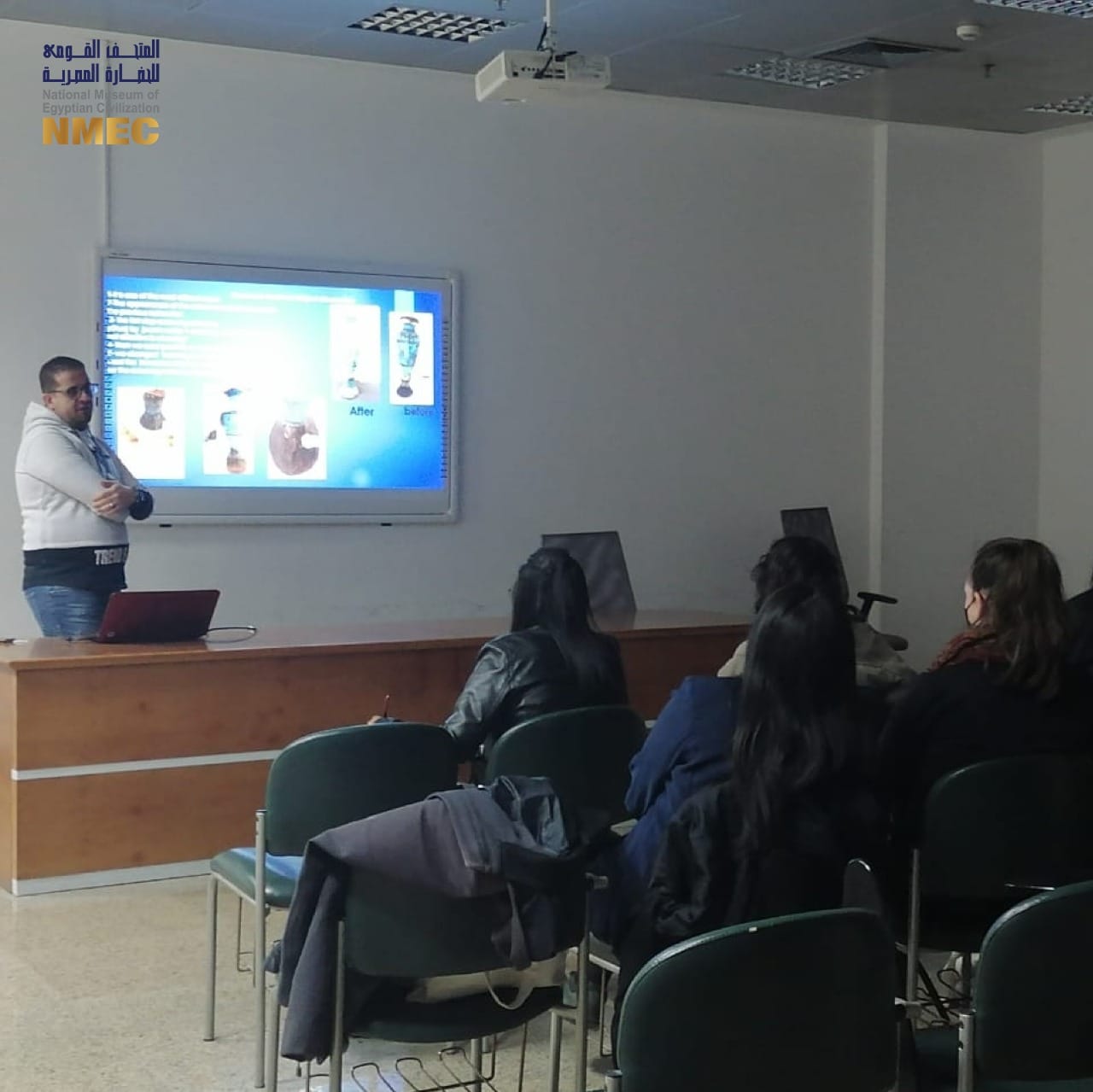 وأوضح المتحف في بيان له منذ قليل، أن محمد وحيد المدير التنفيذي لمركز الترميم قدم محاضرة عن تكنولوجيا صناعة الفخار الأثري، فيما قدم محمد عزت ورشا محمد أخصائيي الترميم بالمتحف محاضرات عن عوامل ومظاهر تلف الفخار ونماذج من مراحل الترميم والصيانة المختلفة، وتم استكمال التدريب العملي للطلاب، حيث اشترك أسامة صلاح رئيس معمل الفخار، مع فريق عمل الإسعافات الأولية في تدريب الطلاب على توثيق وتسجيل الفخار الأثري والتعرف على أحدث طرق الصيانة والترميم تطبيقا علي بعض النماذج.