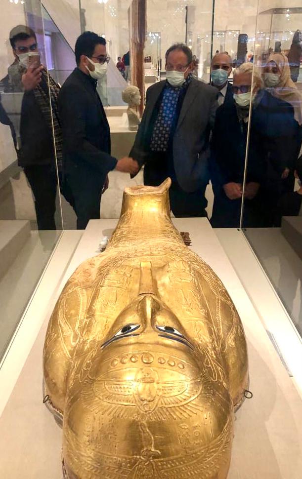 وأجرى الرئيس والوفد المرافق له، جولة داخل المتحف؛ اصطحبهم خلالها الأثري باسم روؤف، أمين بالمتحف؛ تعرفوا خلالها على قاعة العرض الرئيسية وما بها من كنوز، وقاعة المومياوات الملكية؛ التي أصبحت محط أنظار العالم منذ نقلها في إبريل الماضي، في موكب مهيب من المتحف المصري بالتحرير.