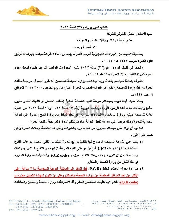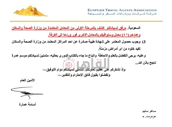 وحصل القاهرة 24 على نسخة من الخطاب المُقدم من الأمين العام لغرفة شركات السياحة، ووكالات السفر لأصحاب الشركات.