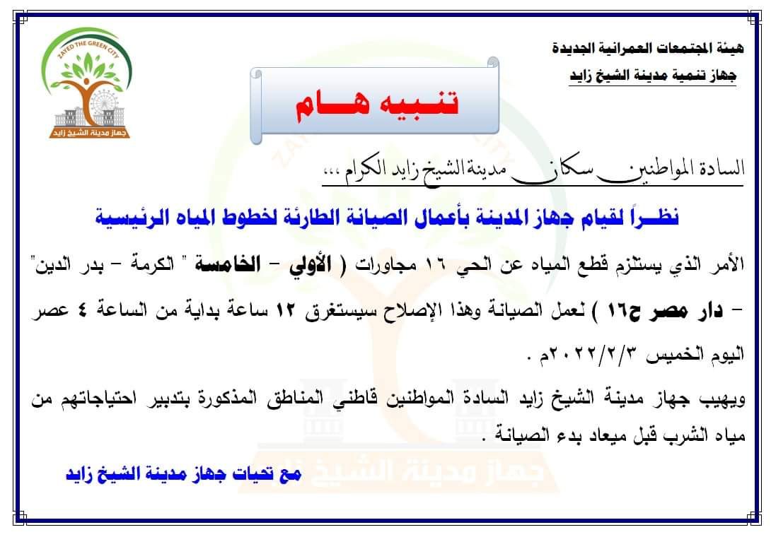 أصدر جهاز مدينة الشيخ زايد بيانًا، من قليل، عن انقطاع مياه الشرب عن الحي 16 مجاورات (الأولى – الخامسة "الكرمة – بدر الدين" – دار مصر ح16) اليوم الخميس، لمدة 12 ساعة، وذلك اعتبارا من الساعة الرابعة عصر اليوم.