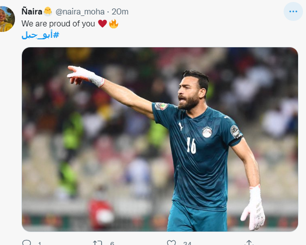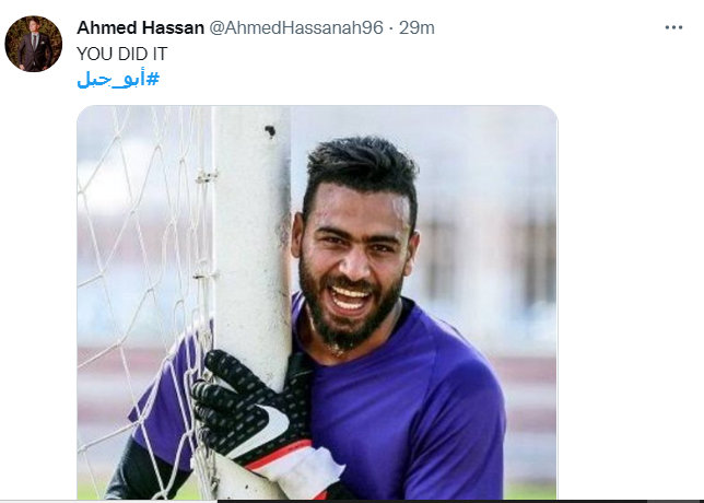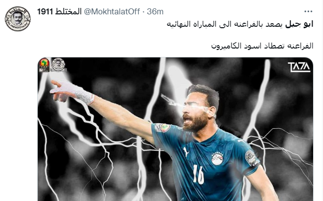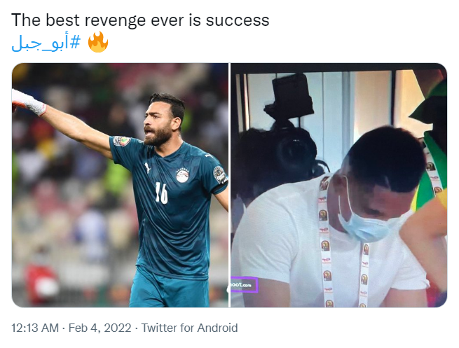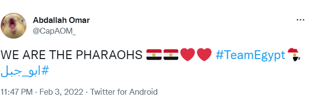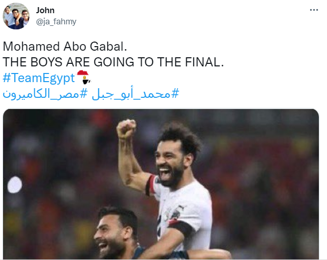 بالإضافة إلى حساب آخر: أبو جبل يصعد بالفراعنة إلى المباراة النهائية، الفراعنة تصطاد اسود الكاميرون، بينما كتب أحمد حسن: لقد فعلها، أبو جبل.