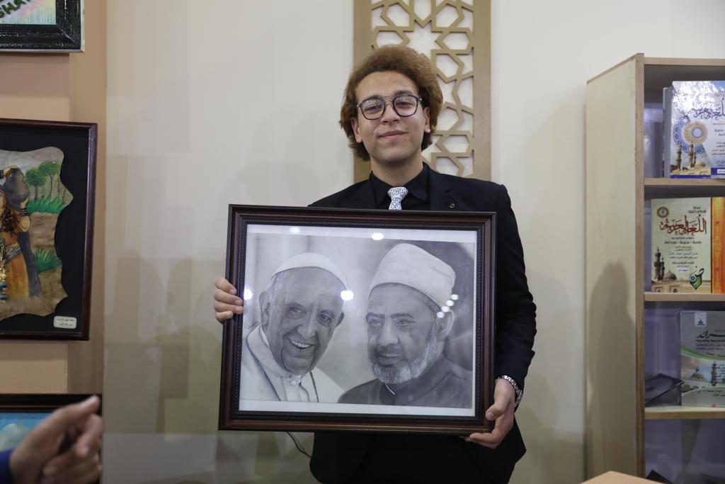 كما حرص الطالب سلمان الشيخ، طالب بكلية الإعلام جامعة الأزهر، على تقديم لوحة فنية لشيخ الأزهر وبابا الفاتيكان، مؤكدًا أن ما قاما به خطوة مهمة لدعم السلام، وأنه استغرق أربعة أيام متواصلة لرسم هذه اللوحة، حبًا في شيخ الأزهر وما يقدمه من خير للإنسانية جمعاء.