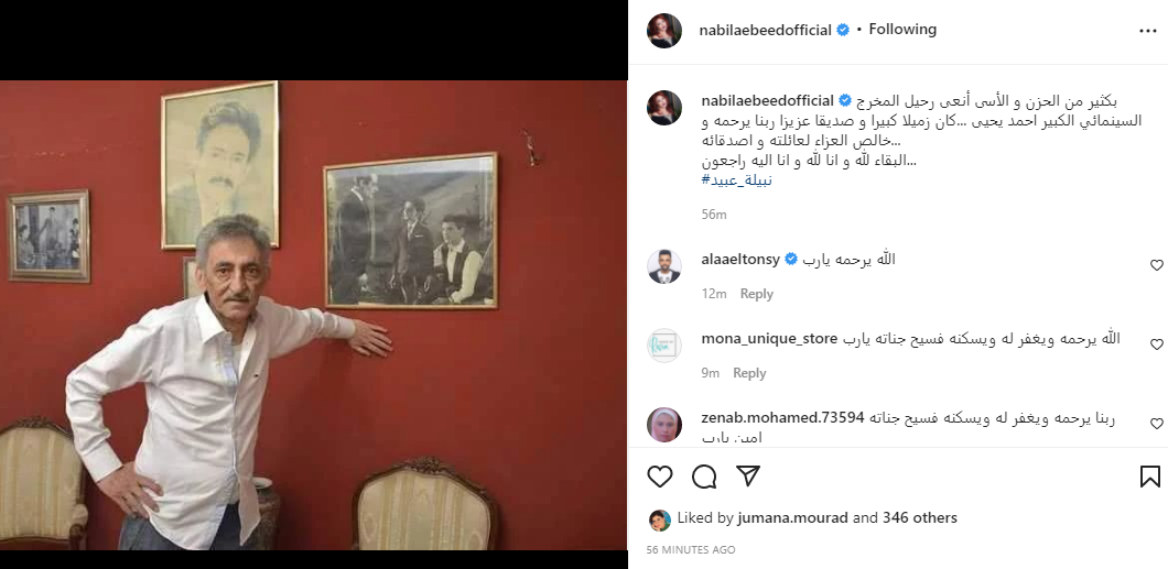 ونشرت نبيلة عبيد صورة للراحل، عبر حسابها الشخصي بموقع تبادل الصور والفيديوهات انستجرام، وعلقت عليها قائلة: بكثير من الحزن والأسى أنعى رحيل المخرج السينمائي الكبير أحمد يحيى، كان زميلًا كبيرًا وصديقًا عزيزًا.