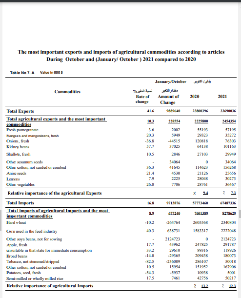 وتابعت النشرة، إلى أن حجم صادرات مصر من الرمان بلغ 57.1 مليون دولار خلال العشرة الأشهر من عام 2021، مقابل 55.1 مليون دولار خلال نفس المدة من العام السابق له 2020، بنسبة زيادة 3.6%.