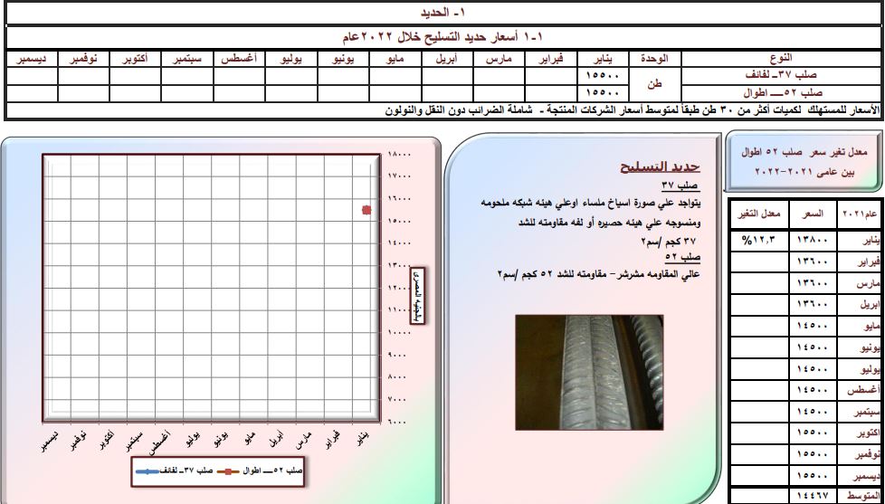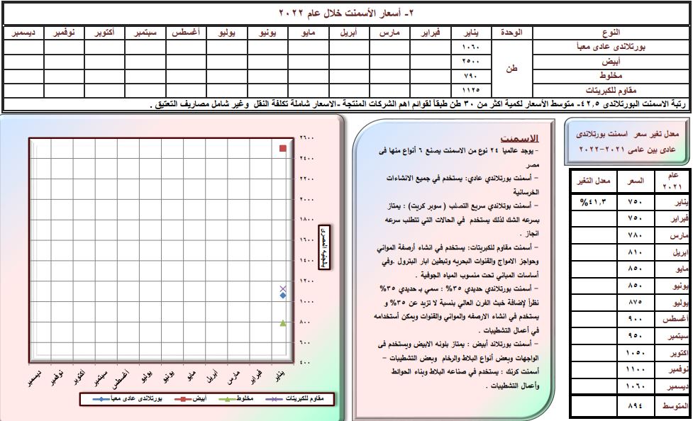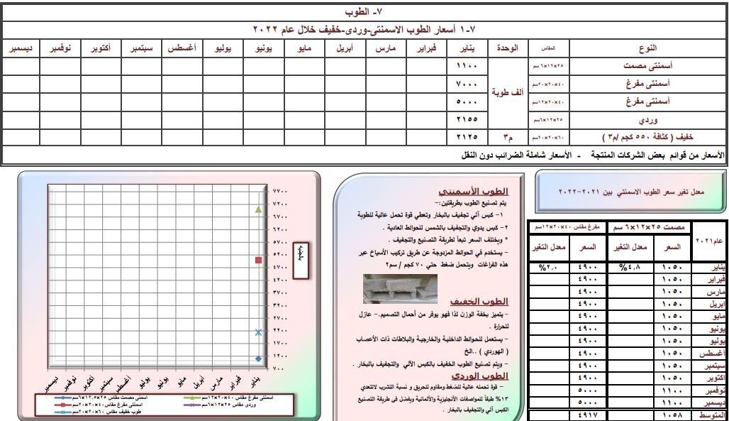 وشهدت حركة الأسعار خلال شهر يناير من العام الماضي 2021، لمواد البناء المستخدمة في قطاع البناء والتشييد متضمنة جدول توضح متوسط الأسعار لكل مادة من هذه المواد، ونسبة التغير في سعر كل مادة خلال عام الإصدار مقارنة مع سعرها العام الذي يسبقه لدراستها وبحث أسباب ونتائج تغيرات الأسعار، مما تساعد هذه الإحصاءات القطاعين الحكومي والخاص على تحديد الأسعار الاسترشادية الخاصة بهم بناء على دراسات الجدوى المبنية على أرقام وإحصائيات صحيحة.