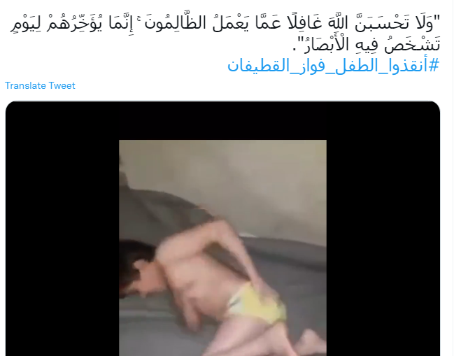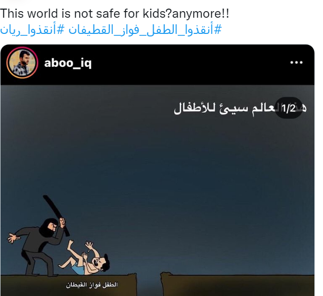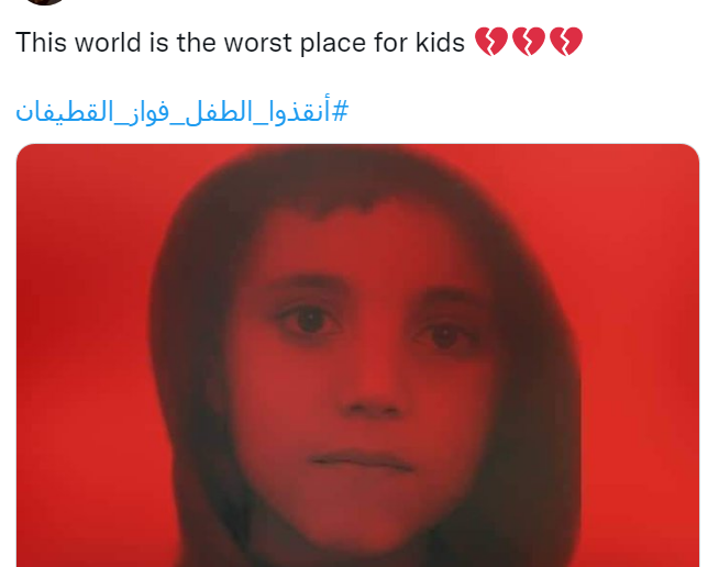 ونشر حساب باسم حيمدة، صورة تجمع الطفل ريان وهو داخل البئر، وأخرى للطفل فواز خلال تعذيبه، قائلة: هذا العالم ليس آمنا للأطفال.. بعد الآن.