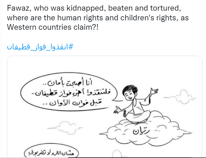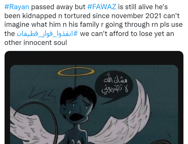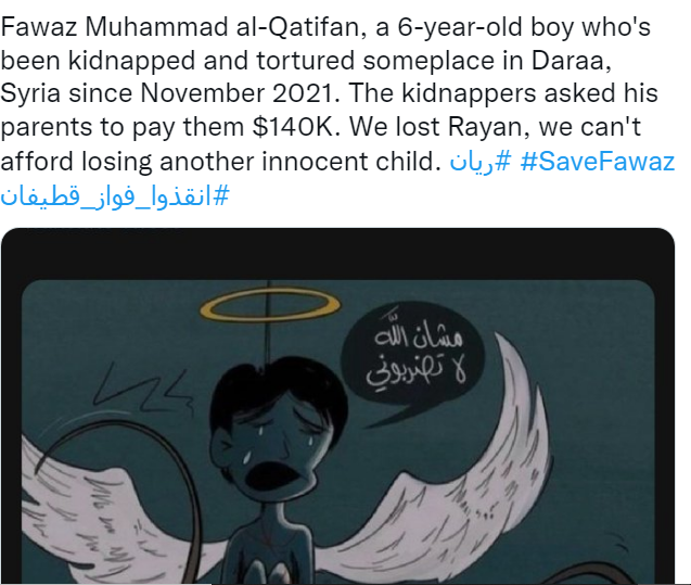 وكتب حساب آخر باسم محمد عنتر: فواز محمد القطيفان، صبي يبلغ من العمر 6 سنوات، تم اختطافه وتعذيبه في مكان ما في درعا، سوريا منذ نوفمبر 2021، طلب الخاطفون من والديه دفع 140 ألف دولار لهم، لقد فقدنا ريان، لا يمكننا تحمل خسارة طفل بريء آخر.