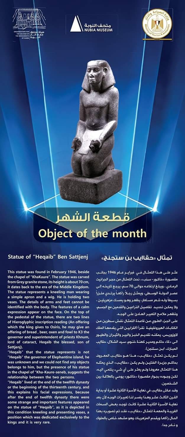 وأوضحت إدارة متحف النوبة في بيان لها، أن تمثال حقا إيب؛ عُثر عليه في فبراير عام 1946، بجانب مقصورة خاكور- سنب، ونُحت التمثال من حجر الجرانيت الرمادي، ويبلغ ارتفاعه نحو 70 سم، ويعود تاريخه إلى عصر الدولة الوسطى.