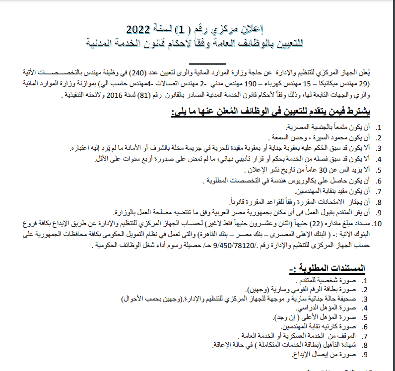 ويفتح الجهاز المركزي للتنظيم والإدارة باب التقديم لمسابقة تعيين وزارة الموارد المائية والري بدء من 20 فبراير حتى 7 مارس المقبل،