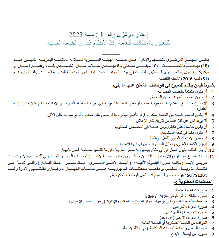 بالنسبة لوزارة النقل؛ أعلنت الهيئة المصرية للسلامة البحرية التابعة لها، حاجتها لتعيين 18 مهندسا، في تخصصات على رأسها سلامة سفن، مهندس مدني.