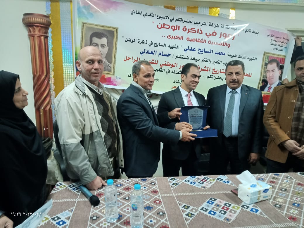 وفى نهاية اللقاء تم تكريم أسم الشهيد الرائد طبيب محمد السايح عدلي، ومنح درع الثقافة للأديب حسام العادلي، ووقف الجميع دقيقة حداد على أرواح الشهداء.
