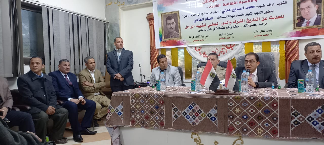 نظم نادى الأدب ببيت ثقافة المراغة شمال محافظة سوهاج برئاسة الشاعر محمد محمدين، اللقاء الثقافي الكبير "رموز في ذاكرة الوطن" للحديث عن التاريخ المشرف والدور الوطني للشهيد الرائد طبيب محمد السايح عدلي، بحضور المستشار والأديب حسام العادلي حفيد الشهيد السايح عدلي، والقيادات المحلية لمركز ومدينة المراغة والقيادات الثقافية وقسم المتابعة بالإقليم.