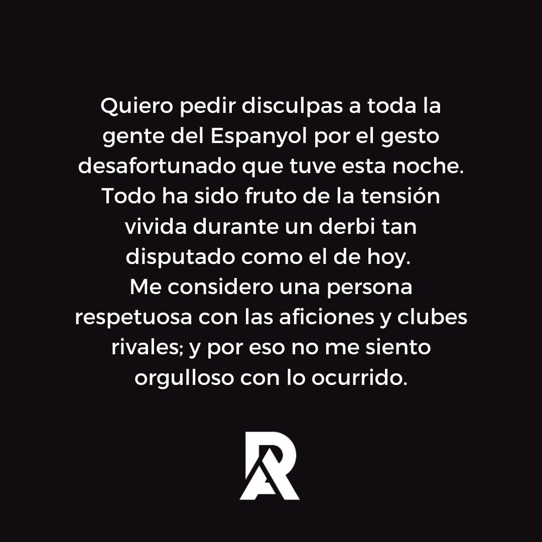 وقال رونالد أراوخو عبر حسابه الرسمي على إحدى مواقع التواصل الاجتماعي تويتر: أعتذر لجميع عناصر فريق إسبانيول لما حدث مني في مباراة الأمس، لست فخورًا بما حدث.