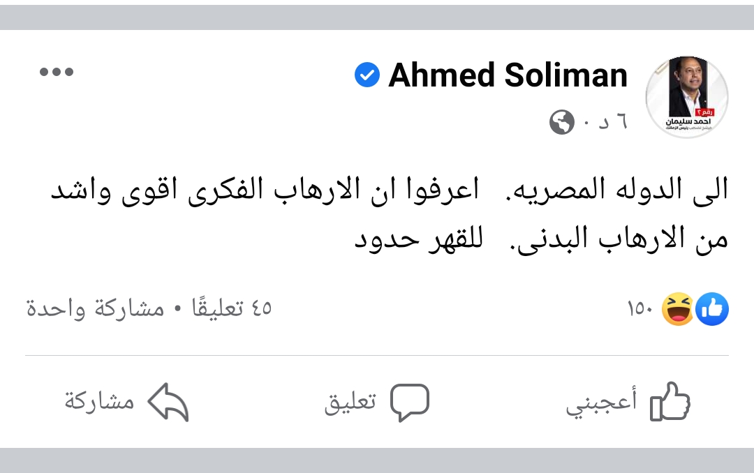 وكتب أحمد سليمان عبر صفحته على موقع التواصل الاجتماعي فيس بوك قائلًا: إلى الدوله المصرية.. اعرفوا أن الإرهاب الفكري أقوى وأشد من الإرهاب البدني.. للقهر حدود.