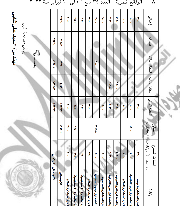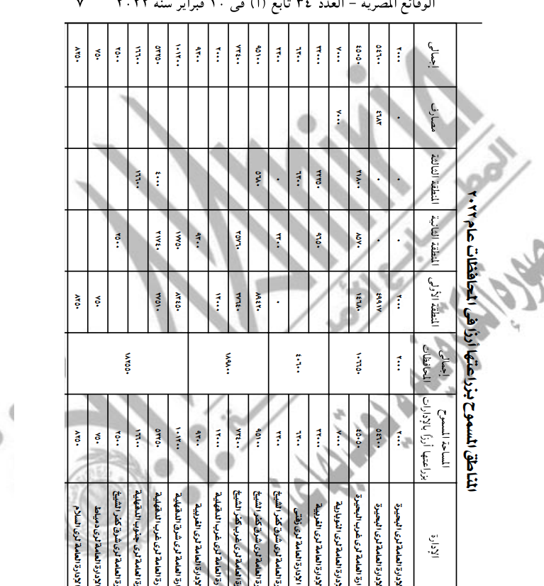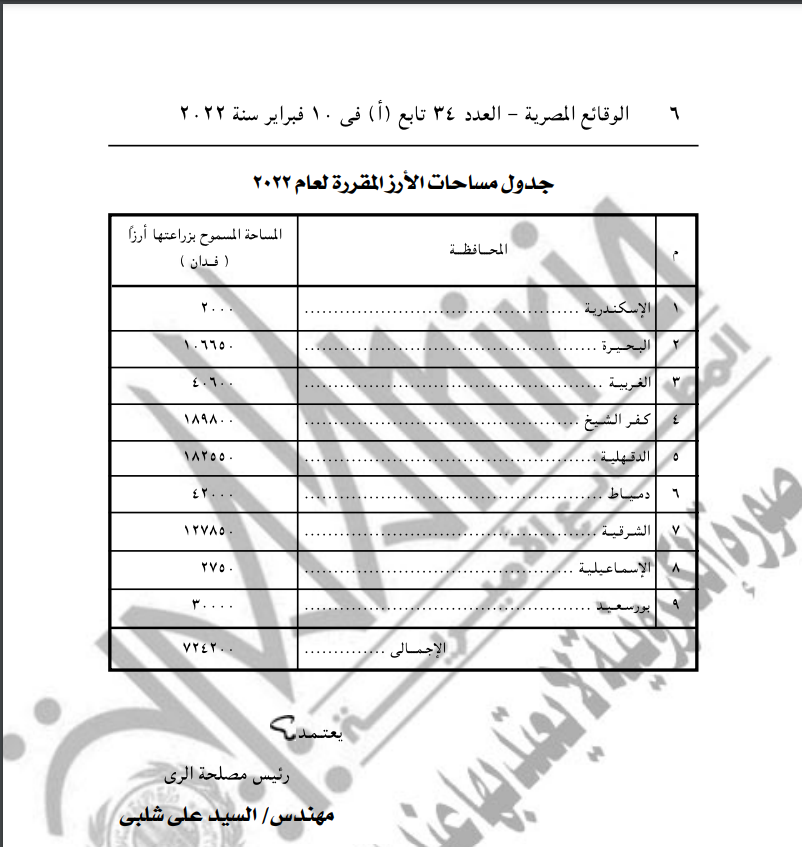 ونصت المادة الأولى من القرار: يرخص بزراعة الأرز لعام 2022 في المحافظات الموضحة بالكشوف المرفقة بهذا القرار بالمساحات المبينة قرين كل منها، بحيث تبلغ جملة المساحة المصرح بها 724200 فدان.