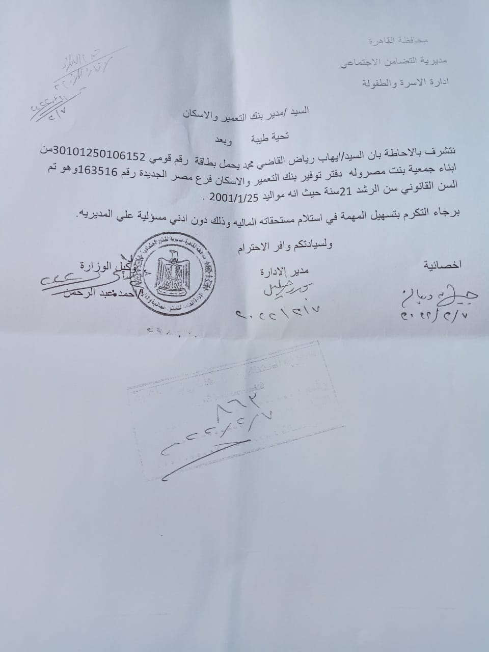 حصل القاهرة 24 على خطاب موجه من مديرية التضامن الاجتماعي إلى مدير بنك الإسكان والتعمير، يفيد بأن الطفل إيهاب رياض أحد أبناء جمعية بنت مصر، ومتوافر له دفتر توفير في بنك الإسكان والتعمير فرع مصر الجديدة رقمه 163516 وبلغ السن القانونية ويحق له تسلم مستحقاته المالية.